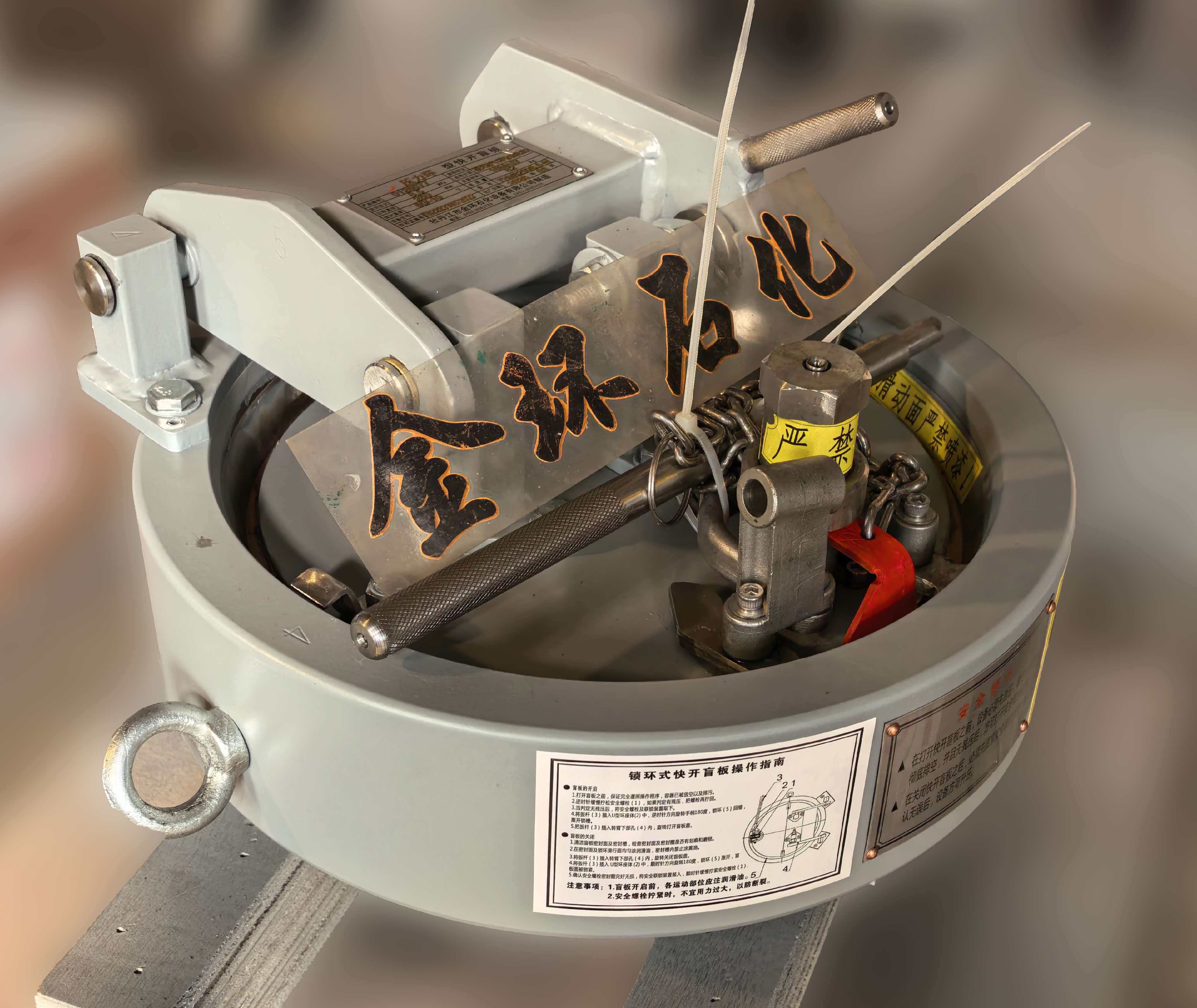 快開盲板是壓力容器快開門蓋的一種型式,廣泛應用在天然氣領域中的需經常啟閉的設備上。常用的快開盲板分為牙嵌型、卡箍型、插扣型、鎖環型、漲環型、固定壓力環型等典型的結構,以手動操作為主。