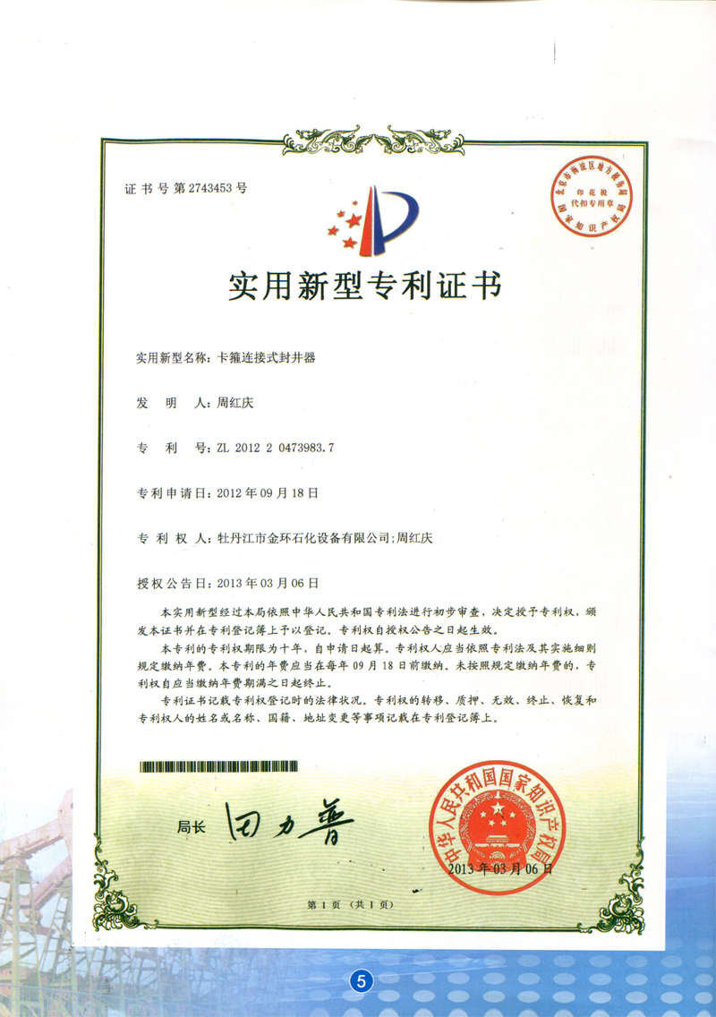 卡箍連接式封井器實(shí)用新型專利證書(shū)ZL 2012 2 0473983.7