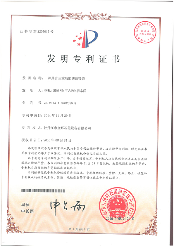 一種具有三重功能的油管錨發明專利證書ZL 2014 1 0702656.8