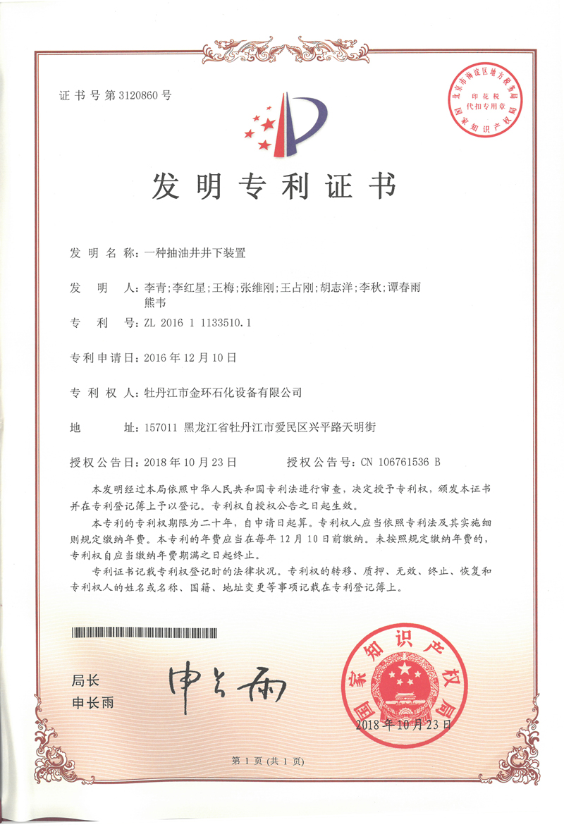 一種抽油井井下裝置發明專利證書ZL 2016 1 1133510.1